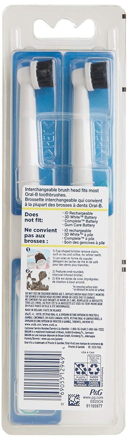 The Oral B Charcoal replacement toothbrush head features end-rounded, charcoal-infused bristles. Cup-shaped bristles remove stains, such as tea and coffee, for whiter teeth. The round brush head is inspired by dental professional tools for a tooth-by-tooth clean, with specially engineered bristles for optimal tooth coverage. Each order comes with 3 Oral B Charcoal electric replacement toothbrush heads. Fits most Oral B rechargeable handles (does not fit Oral B iO).