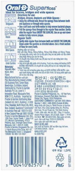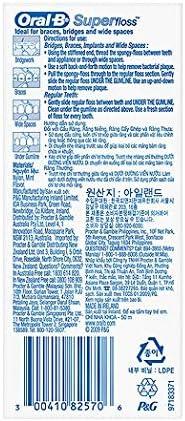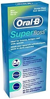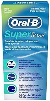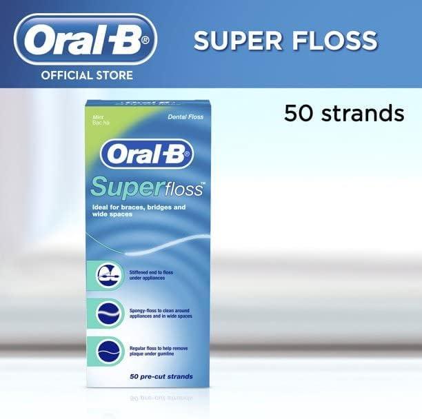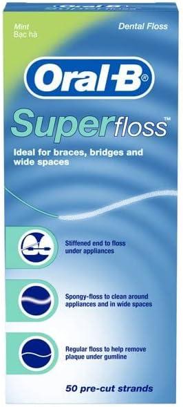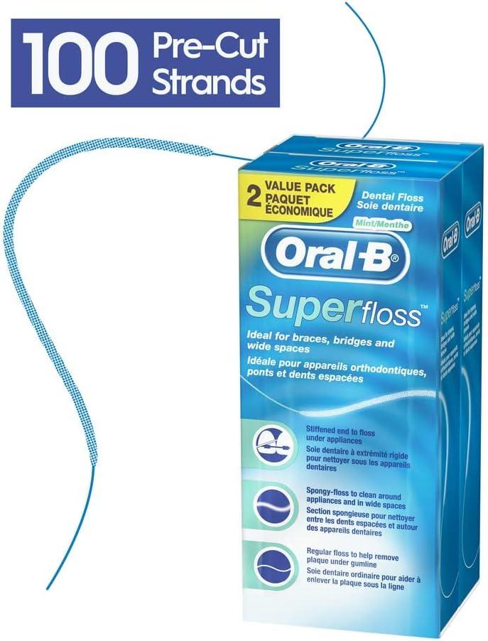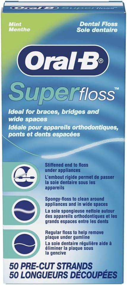 Oral-B Super Floss is ideal for braces, bridges and wide spaces between teeth. Its three unique components-a stiffened-end dental floss threader, spongy floss and regular floss to remove plaque-all work together for maximum benefits.