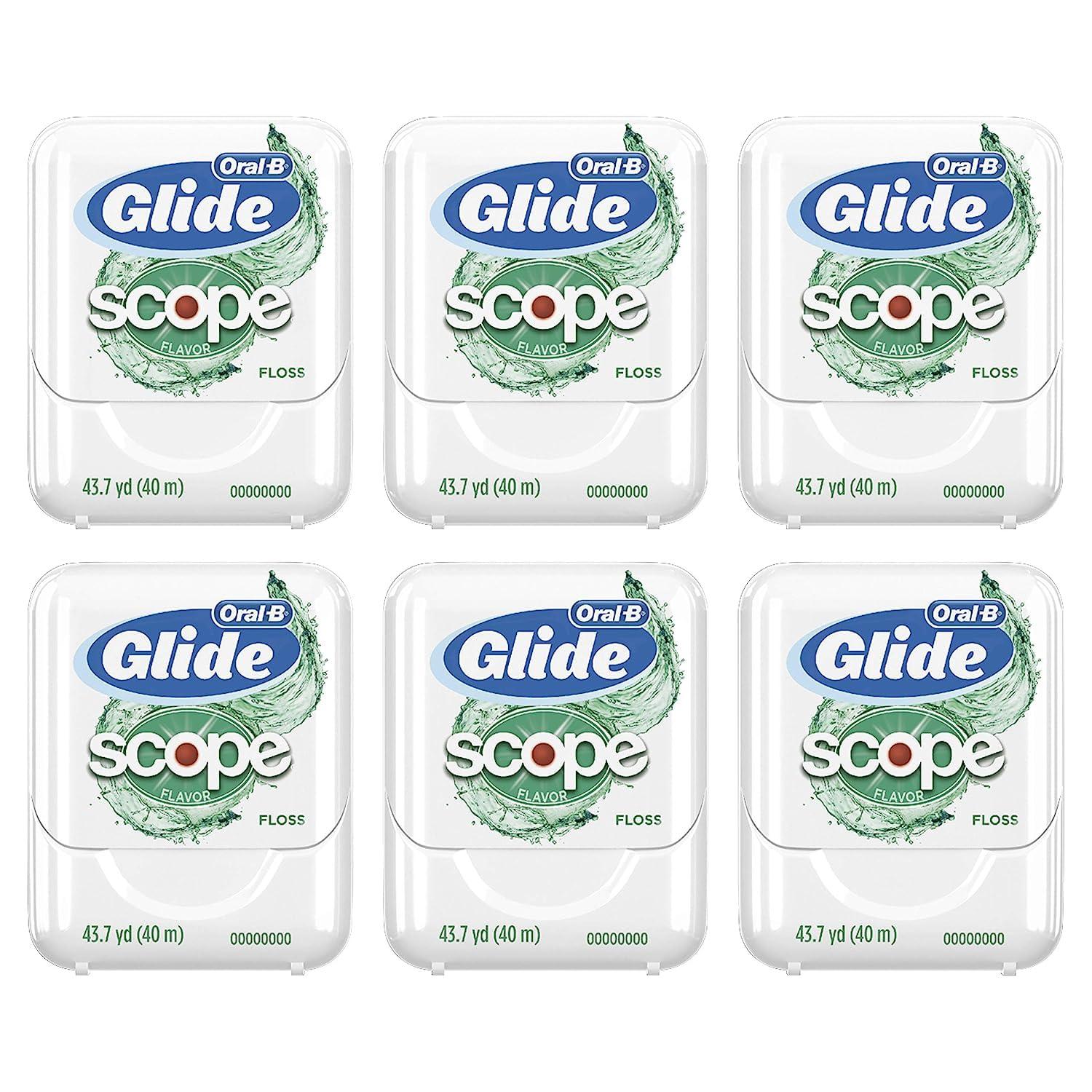 Includes six 43.7 yard packs of Oral B glide with Scope (flavor) floss