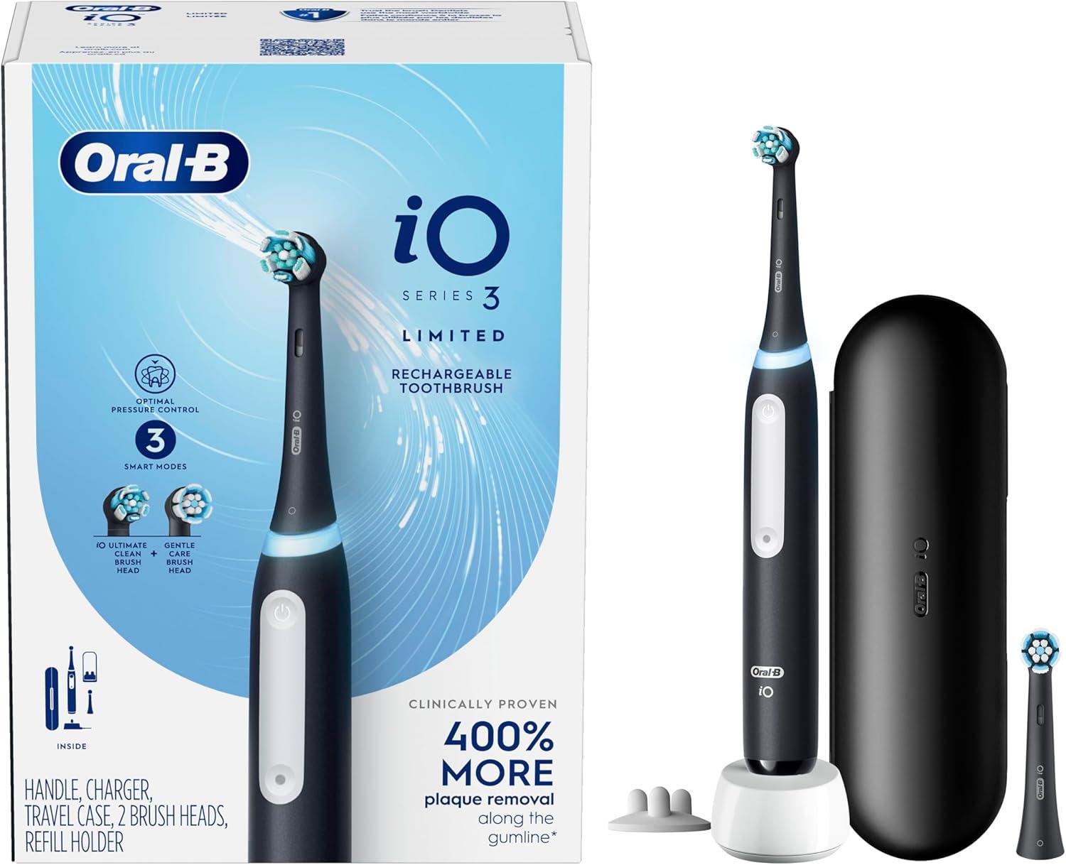 Oral-B iO Deep Clean Rechargeable Electric Powered Toothbrush, Icy Blue with iO Series 3 Limited, 2 Brush Heads and Travel Case – Pressure Sensor to Protect Gums – 3 Cleaning Settings – 2 Minute Timer(Black)