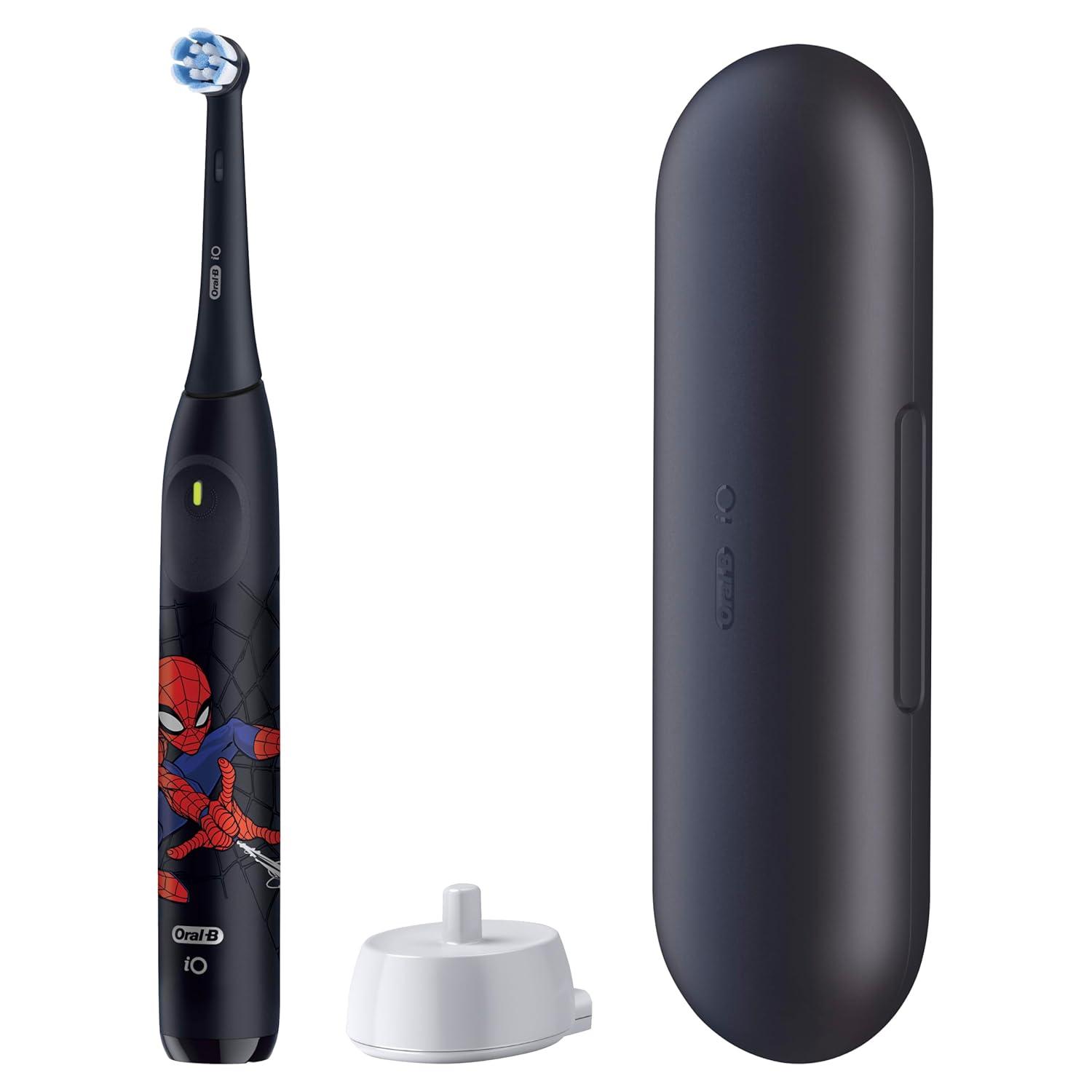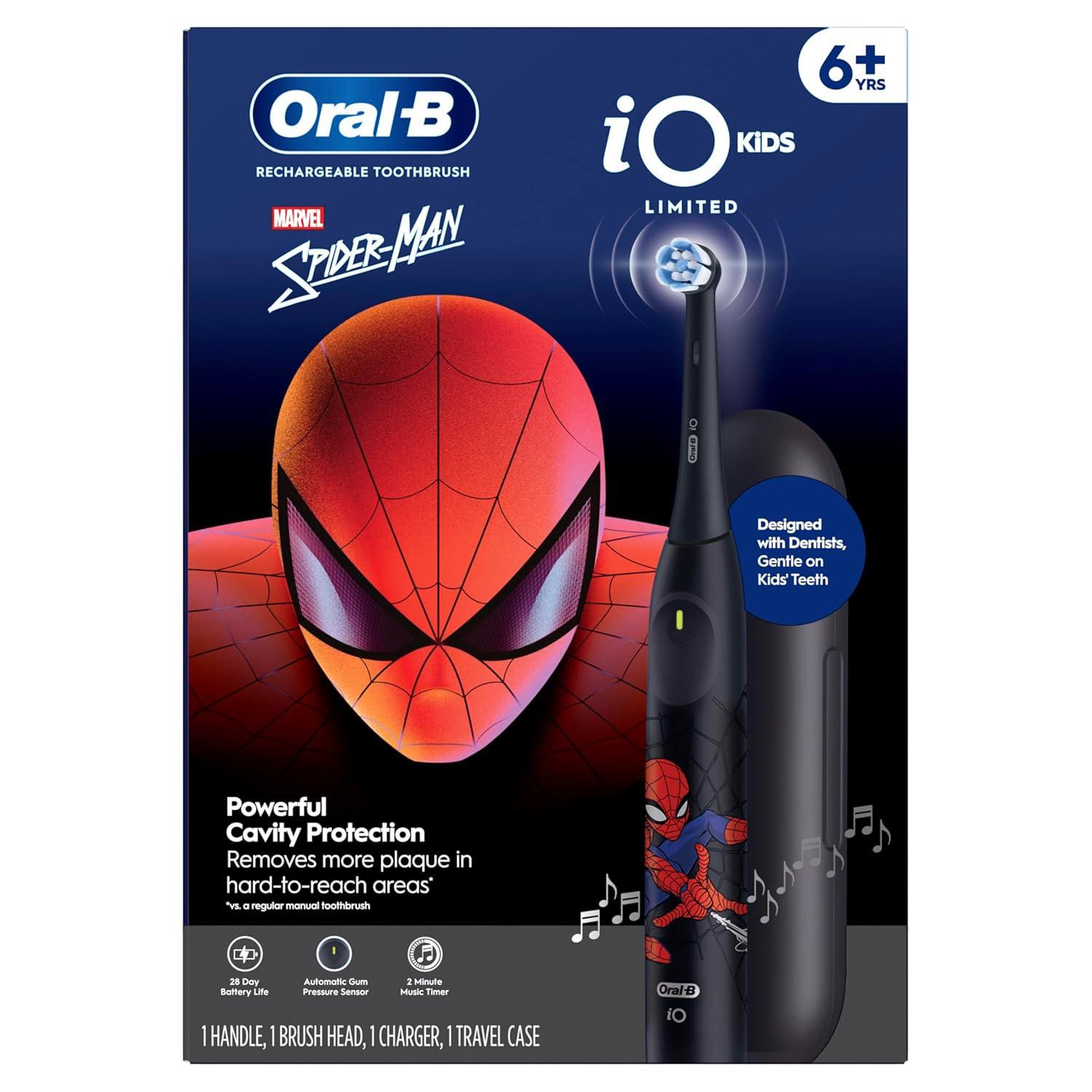 The Oral-B iO Kids Spiderman Limited combines gentle micro vibrations with Oral-B's dentist inspired round brush head to remove more plaque in hard-to-reach areas vs. a regular manual toothbrush, and deliver powerful cavity protection for kids 6+. It is designed to teach kids to become independent brushers and develop healthy habits for life, with features that make brushing fun: 2-min music timer, automatic gum pressure sensor, and 3 cleaning settings. Includes a travel case to store and carry the toothbrush wherever your kids go. 9 out of 10 kids love brushing with it!