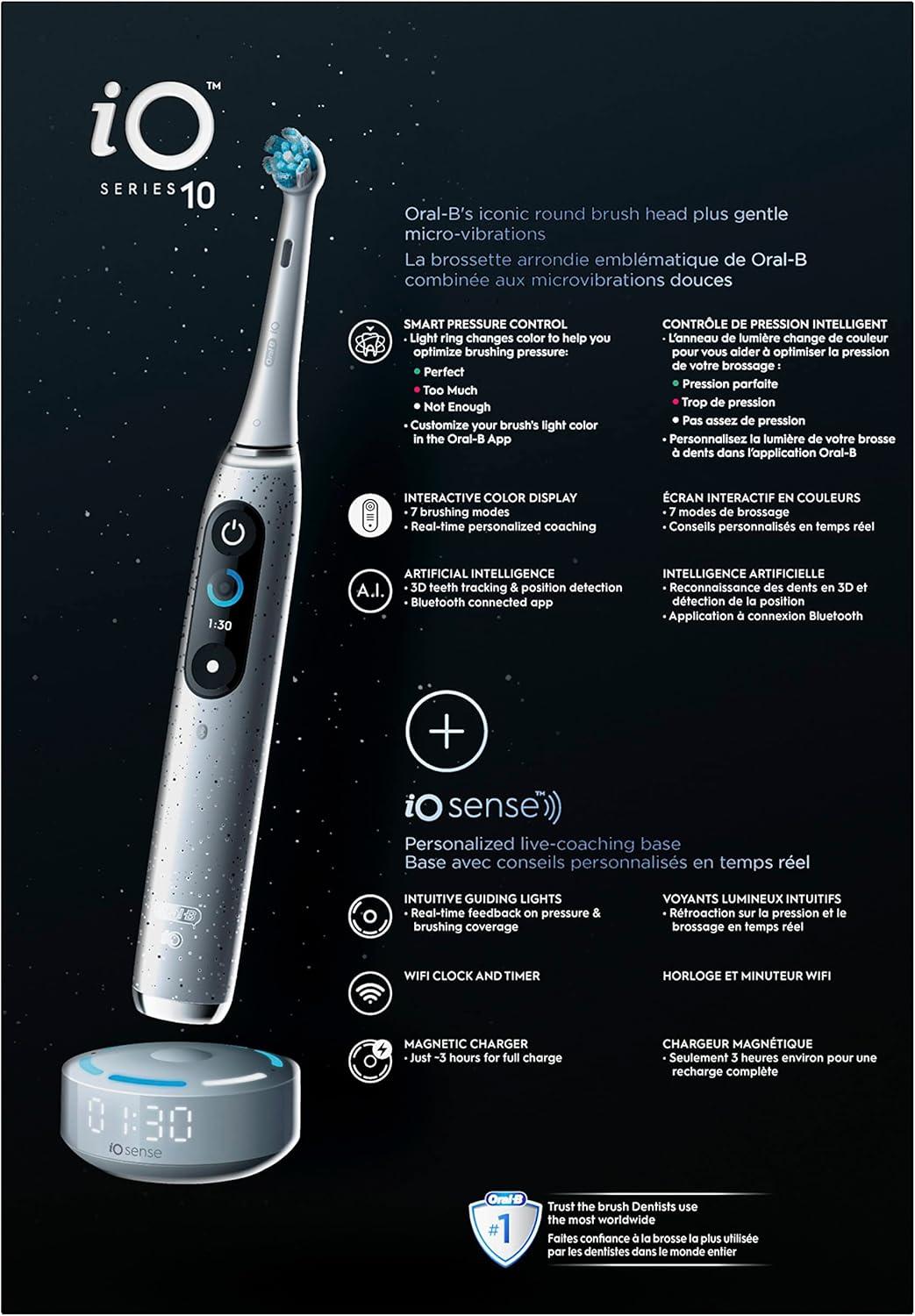 Discover the most advanced technology in the iO series yet. This Oral-B iO Series 10 Electric Toothbrush comes with the iO Sense, a smart charger that personalizes your brushing experience with real-time feedback. The in-handle interactive color display makes it easier to select a brushing mode, lets you know if you are brushing correctly, and informs you when brush heads need to be replaced to continue to get the best cleaning results. The dentist-inspired round brush head is combined with the power of micro-vibrating bristles to provide you with a complete, purifying clean. Oral-B iO Series 10 Electric Toothbrush comes with live coaching that recognizes your brushing style and makes sure you are brushing across all 6 zones of your mouth, giving you a professional clean feeling and gum care like never before. This Electric Toothbrush helps you protect your gums with its pressure sensor that alerts you when you are brushing too hard or too softly, so you can get your best clean with the right amount of pressure. With the Oral-B iO 10 Electric Toothbrush you can take care of your specific needs with its 7 smart brushing settings that include Daily Clean, Sensitive, Gum Care, Intense Clean, Super Sensitive, Tongue Clean, and Whitening. Sync your iO Electric Toothbrush with the free Oral-B app to create long-term goals that will help you achieve a healthier smile. Do not use on children under age 3. Replace brush head every 3 months or sooner if brush head becomes worn. Oral-B-the #1 brand used by dentists worldwide.*Based on surveys of a representative worldwide sample of dentists carried out for P&G regularly.