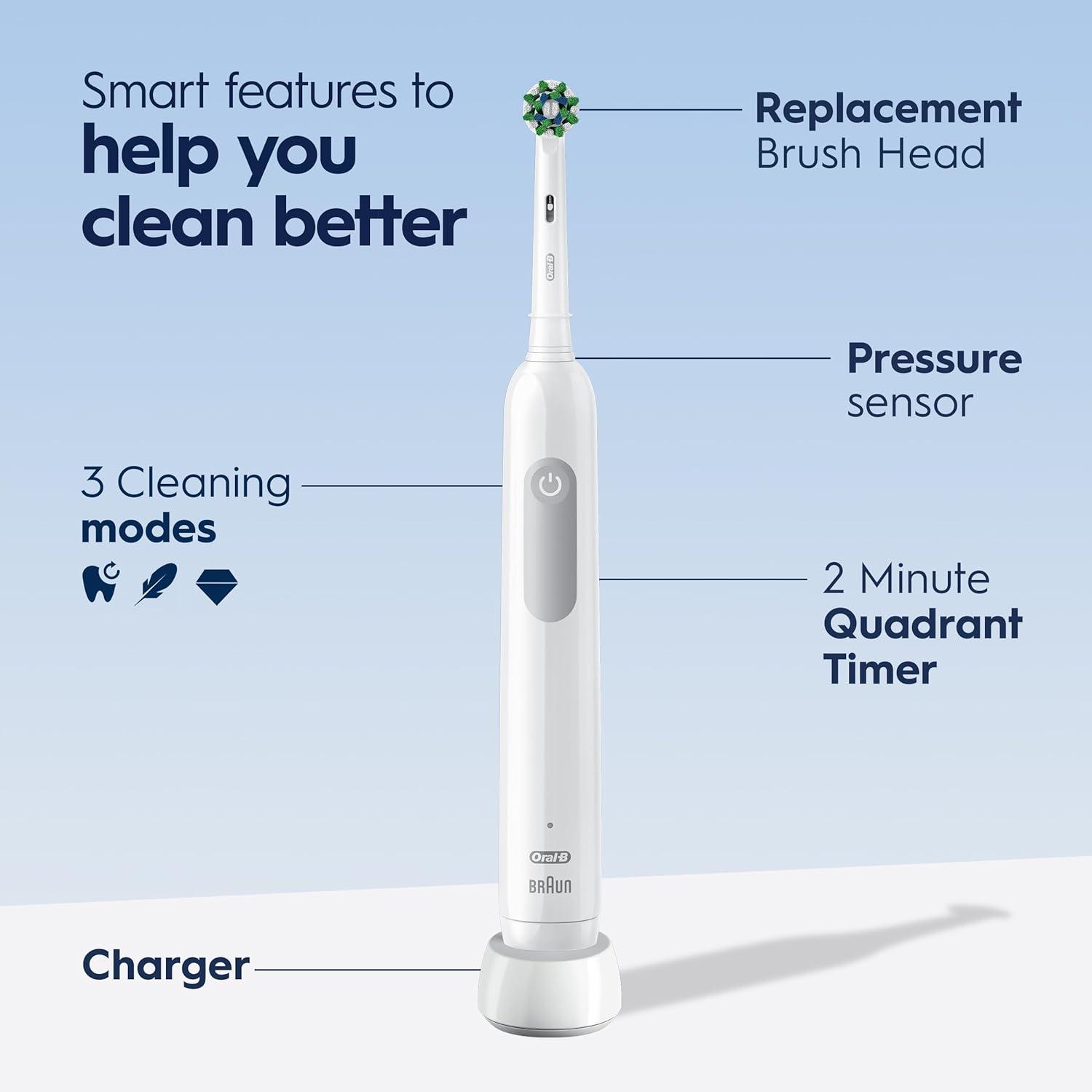 The Oral-B Pro 1000 rechargeable electric toothbrush provides a clinically proven superior deep clean in hard-to-reach areas vs. a regular manual toothbrush. 300% MORE plaque removal along the gumline versus a regular manual toothbrush. The professionally inspired design of the CrossAction brush head surrounds each tooth with bristles angled at 16 degrees. The Oral-B Pro 1000 has 3D cleaning action that oscillates, rotates, and pulsates to break up and remove plaque along the gumline than a regular manual toothbrush. The pressure sensor stops pulsations if you brush too hard to prevent harmful over-brushing and there are 3 modes. The toothbrush also includes an in-handle timer to help you brush for a dentist-recommended two minutes. Best of all, it is brought to you by Oral-B, the #1 brand used by dentists worldwide.Based on surveys of a representative worldwide sample of dentists carried out for P&G regularly. Do not use on children under age 3. Replace brush (head) every 3 months or sooner if brush head becomes worn.