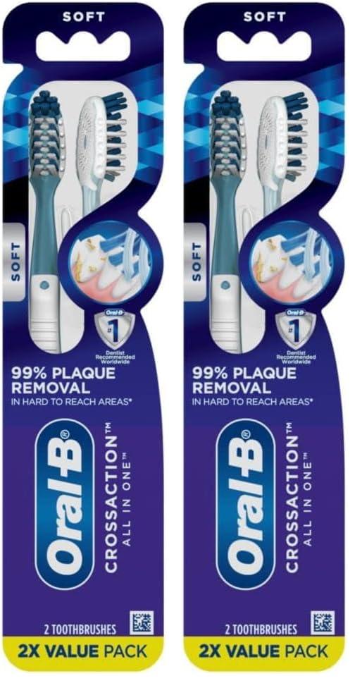 The Oral-B CrossAction All In One Manual Toothbrush bristles attack plaque from the perfect angle cleaning better than a flat trim brush with straight bristles. Plus, Pro-Health's tongue cleaner helps remove germs from the tongue. Color may vary.