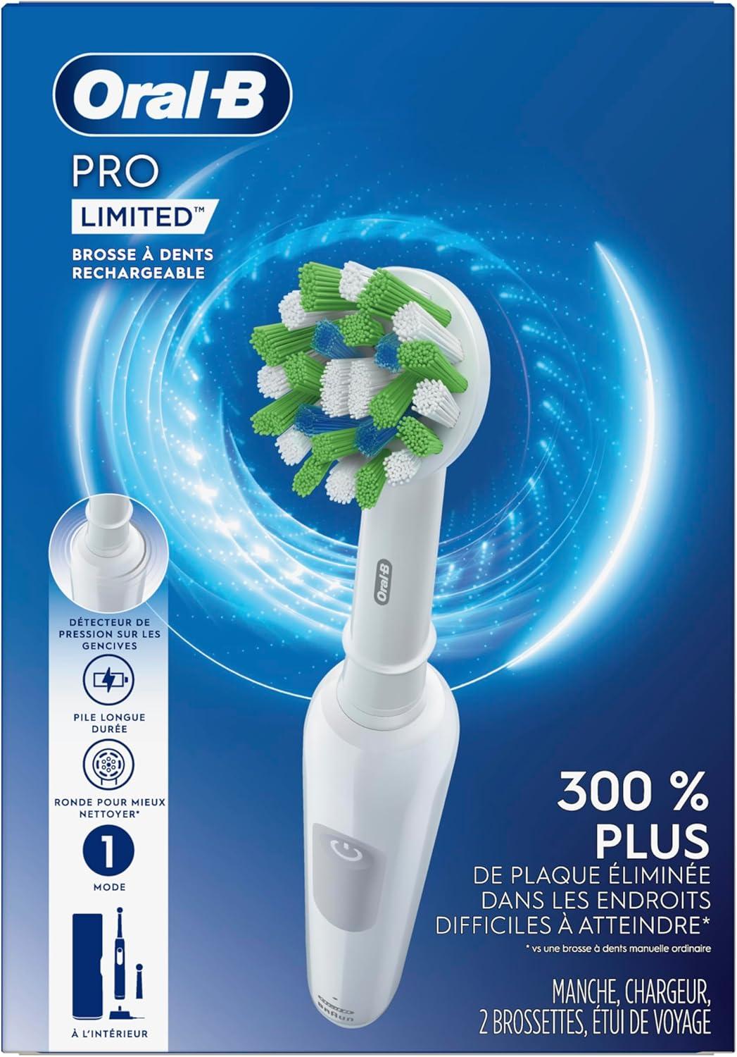 The Oral-B Pro Limited rechargeable toothbrush provides a clinically proven superior clean vs. a regular manual toothbrush. The professionally inspired design of the CrossAction brush head surrounds each tooth with bristles angled at 16 degrees, and 3D cleaning action oscillates, rotates, and pulsates to break up and remove up to 300% more plaque along the gumline than a regular manual toothbrush. The pressure sensor stops pulsations if you brush too hard to prevent harmful over-brushing and there is 1 mode, plus an in-handle timer to help you brush for a dentist-recommended 2 minutes. Trust in the precision engineering of Braun and the dental expertise of Oral-B, the #1 brand used and recommended by dentists worldwide. 100% Satisfaction Guaranteed. Manufacturer Contact Information Customer support : (800) 566-7252 or (800) 566-ORALB