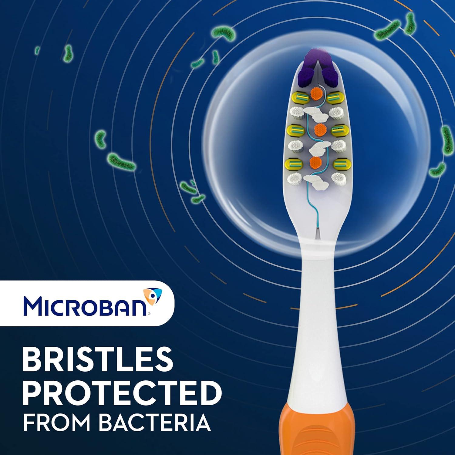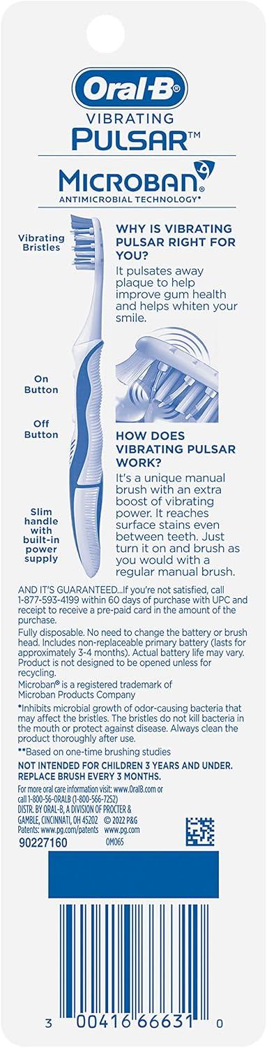 The Oral-B Pulsar Microban toothbrush has battery powered Vibrating bristles to help breakup plaque between teeth. This toothbrush removes 90% of plaque in hard to reach places. These bristles are protected from bacteria*. Oral-B is #1 Used by Dentists Worldwide. *Inhibits microbial growth of odor-causing bacteria that may affect the bristles. The bristles do not kill bacteria in the mouth or protect against disease. Always clean the product thoroughly after use.